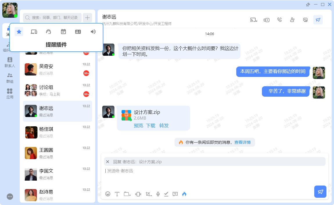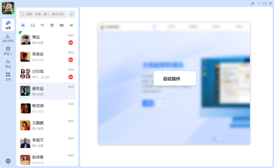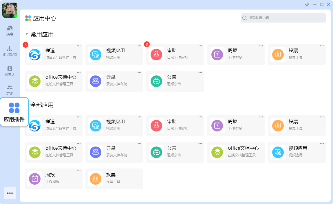 - [4] 应用插件:在即时通讯面版的最下面,主要是快速打开第三方应用,如OA系统